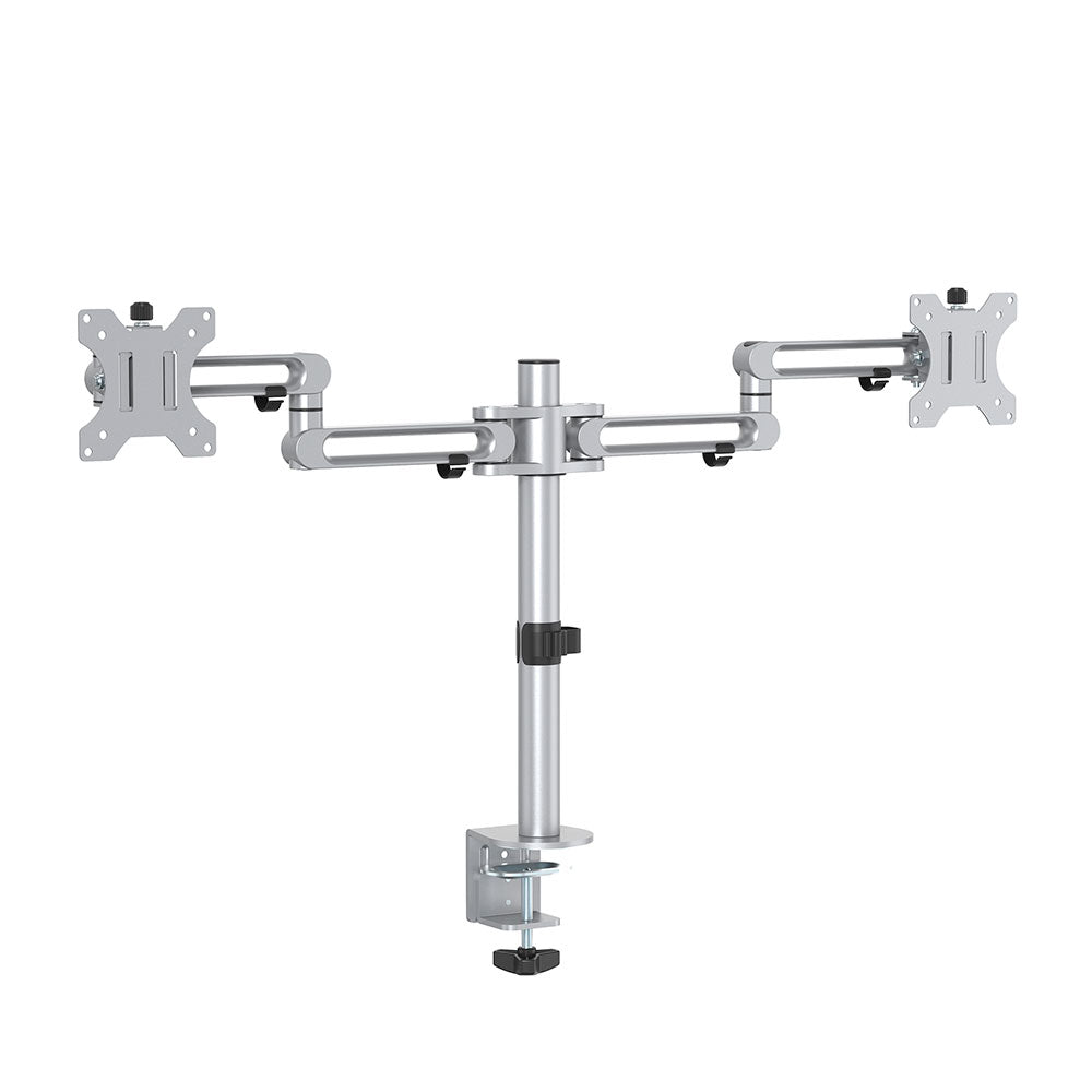 The Standard Dual monitor arm combines value and versatility into a single solution. Its aluminum construction provides a stylish and elegant look, complementing any home or office décor. The flexible arm joint and rotating/tilting VESA plate allow users to adjust the height and angle of their monitors for an optimal viewing experience. Designed for versatility, it easily rotates between portrait and landscape orientation, making it ideal for various applications. Screen specifications: 17”-32”, weight capacity of 8kg per screen Universal 75mm and 100mm Vesa plate fixing 360° Rotary VESA Plate: for better viewing experience Free-Tilting Design: for multiple monitor viewing angles Built-in Cable Management: for an organized and neat workspace Aluminium Construction: provides a sleek, lighter, and elegant look Quick-Release VESA Plate: for easy installation Keyhole Pattern: allows easy installation Swiveling Arm(s): offer(s) maximum viewing flexibility